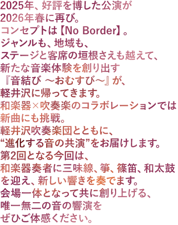 音を通じて会場がひとつになる。この日だけの特別なアンサンブルを、心と体で存分に体感ください。